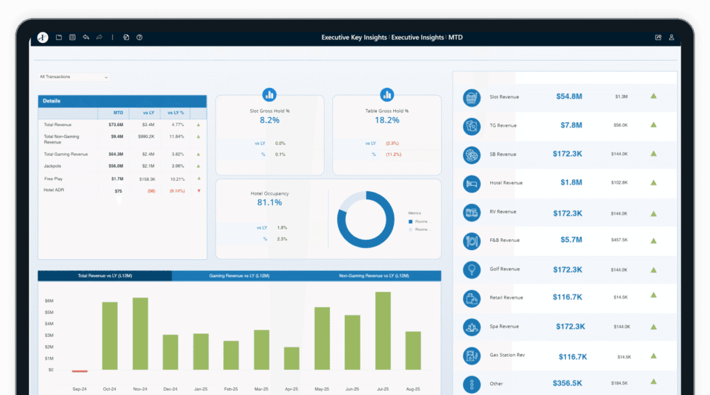 Insight Analytics turns overwhelming data into clarity and action. By unifying property data across gaming, hotel, food and beverage, and retail, it delivers consistent insights 24/7 in near real time. Leaders gain KPIs, revenue trends, slot optimization, and player segmentation to align strategy, identify opportunities, and drive results. Saves 20+ hours weekly with automated DORs, daily inbox reports, and faster course corrections.